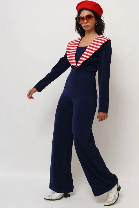 Macacão marinheiro vintage azul e listras vermelhas